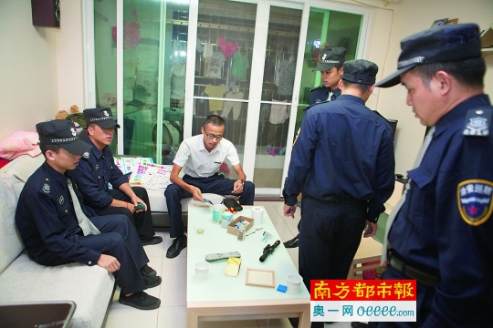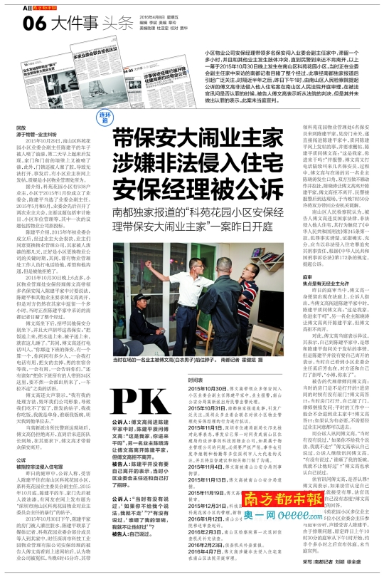 2015年10月30日晚上6点多,小区物业管理处安保经理傅文高(白衣)带领多名保安闯入业主家中。南都记者 霍健斌 摄
